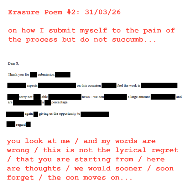 It turns out that I can. This poem sits in incredibly illustrious company on the website owned by a former Forward Prize winning poet. It's title is a location created by https://what3words.com which has become a new form of sedition, as it turns out a really smart way of hiding intent in plain sight. I can't talk about the project right now either as the pamphlet it comes from is in contest.